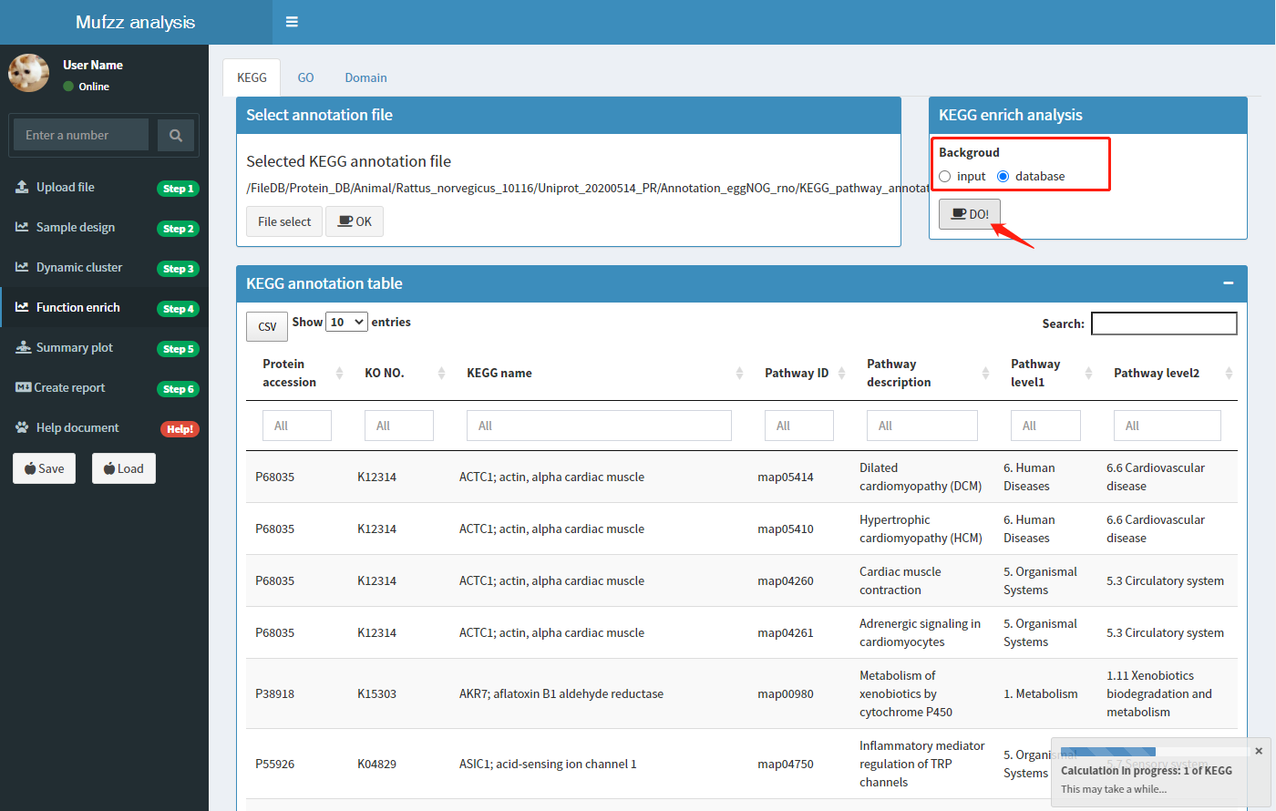 富集分析背景:对聚类分析得到每个cluser中的蛋白进行功能富集分析,探究特定cluster中蛋白相比‘背景’蛋白来说功能偏向性。这里的背景可以是输入文件SD过滤后的所有蛋白(input),也可以选择物种所有的蛋白(database)。默认参数为'input'。确定参数后,点击'DO!'按钮开始分析。分析过程中浏览器右下方会显示分析进度条。