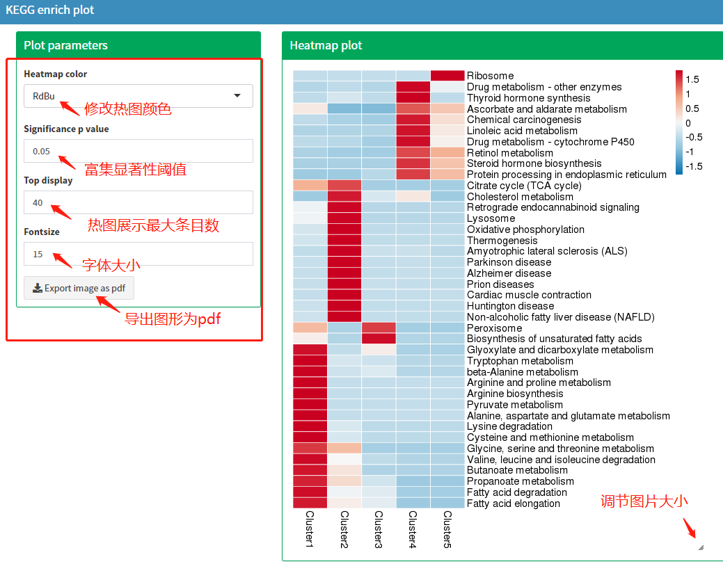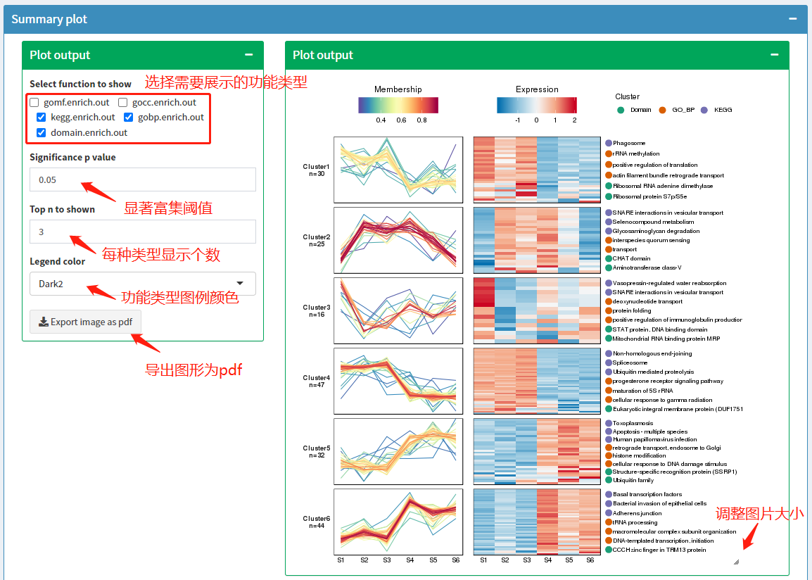 完成前面所有步骤后,页面会显示如下图所示图形。左侧有4个参数可以调整结果展示内容和形式,有一个按钮可以导出图形为pdf,图片右下角按钮拖动可以调节图片大小。