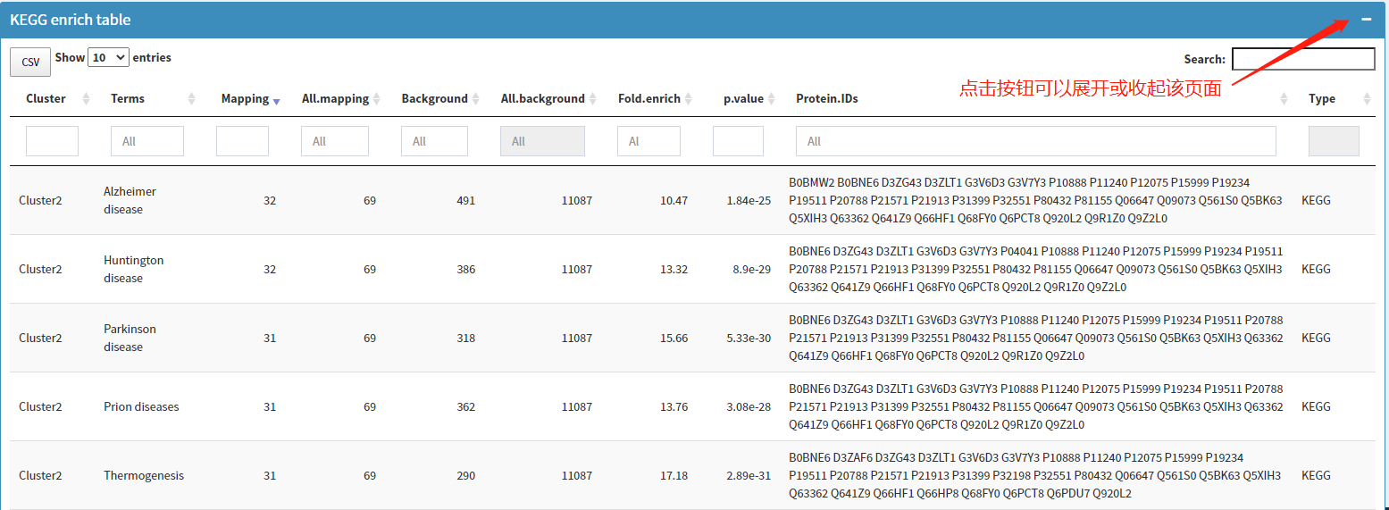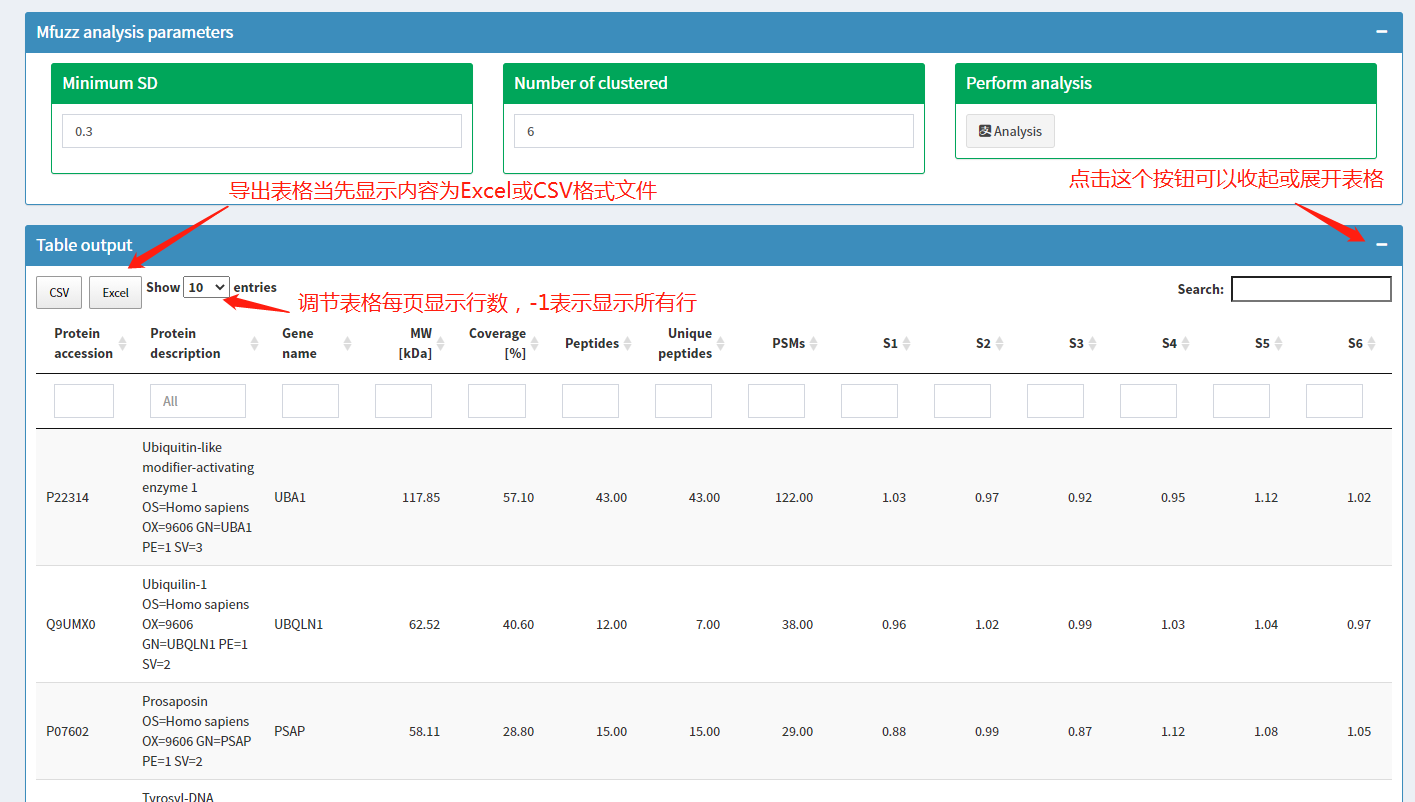 分析完成后,Table output页面通过表格形式展示分析结果。点击Table output页面右上角'+/-'可以展开或收起页面。展开页面后,显示如下界面:可以对表格进行筛选、查询、排序,导出表格内容。表格最后两列显示了蛋白对应的cluter分类信息。通过计算一个叫 membership 的统计量判断蛋白质所属的聚类群,某蛋白哪个类的membership值最高,就属于那类。