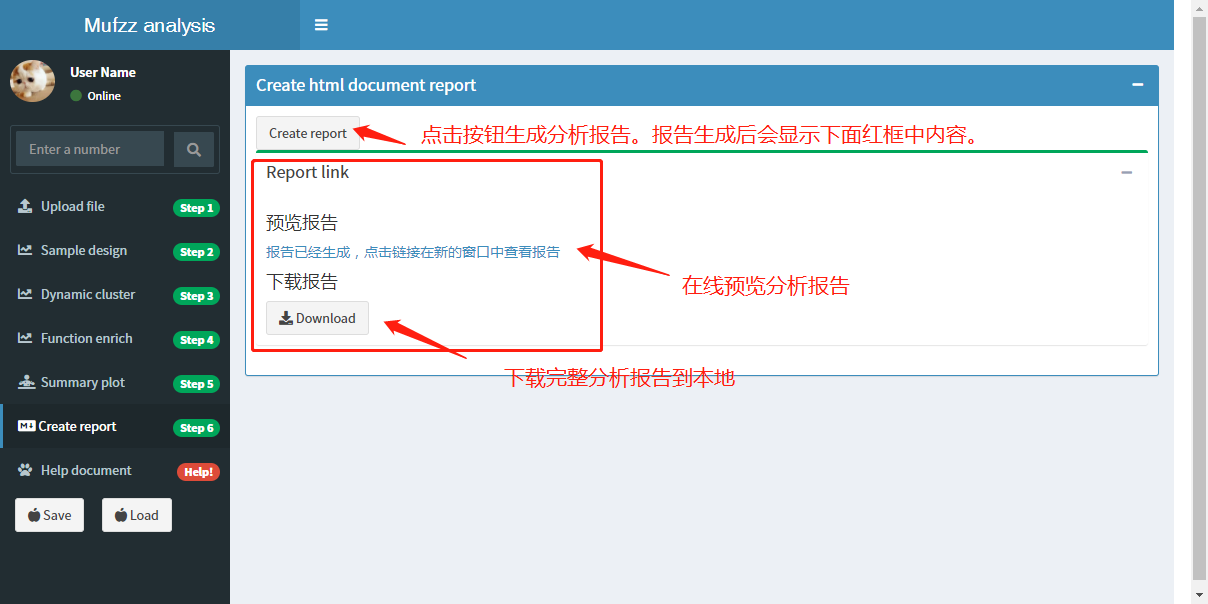 完成前面所有步骤后,点击Create report按钮即可根据当前分析结果生成报告。报告创建完成后,在页面中有‘在线预览报告’和‘下载报告’两个功能。如下图所示