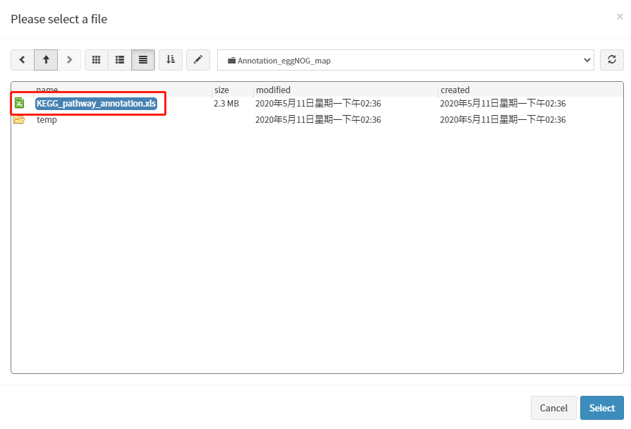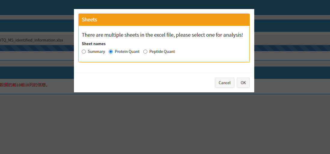 输入文件支持tab符分隔的txt、csv、Excel三种格式文件。如果输入文件为Excel格式,当Excel文件中包含多个sheet时,upload完成后要求选择其中一个sheet作为输入数据。