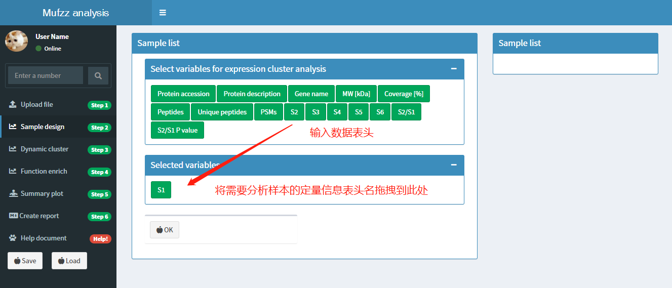 如下图所示:输入文件upload完成后,切换到Sample design页面。该页面中显示了输入文件所有表头的名称。将包含样本信息的表头名称用鼠标从上面拖拽到下面。样本的顺序也可以通过拖拽来调整。