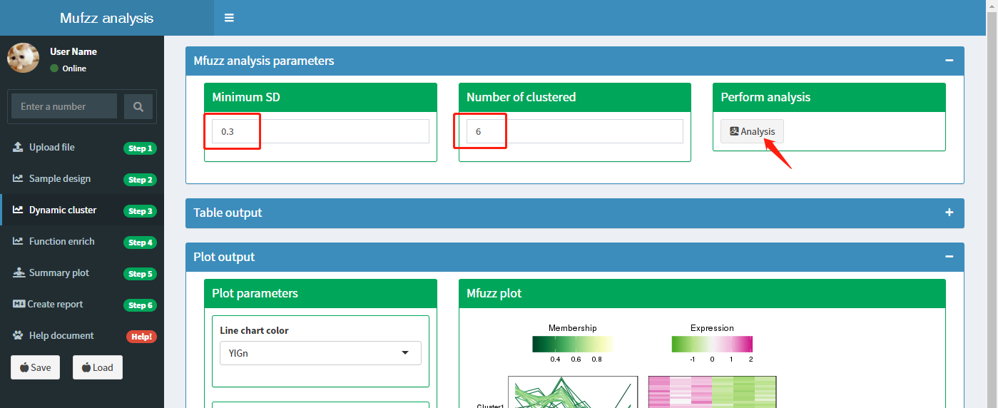 如下图所示:聚类分析有2个可以选择的参数。Minimnm SD: 将在不同样本中表达量标准差异小于该阈值的蛋白过掉;Number fo clustered: 指定通过聚类分析将蛋白分为多个cluster。默认Minimum为0.5,Number of clustered为6。点击Analysis按钮开始分析。分析过程需要等待10秒左右,网页右下方会显示分析进度条,进度条消失后表示分析完成。