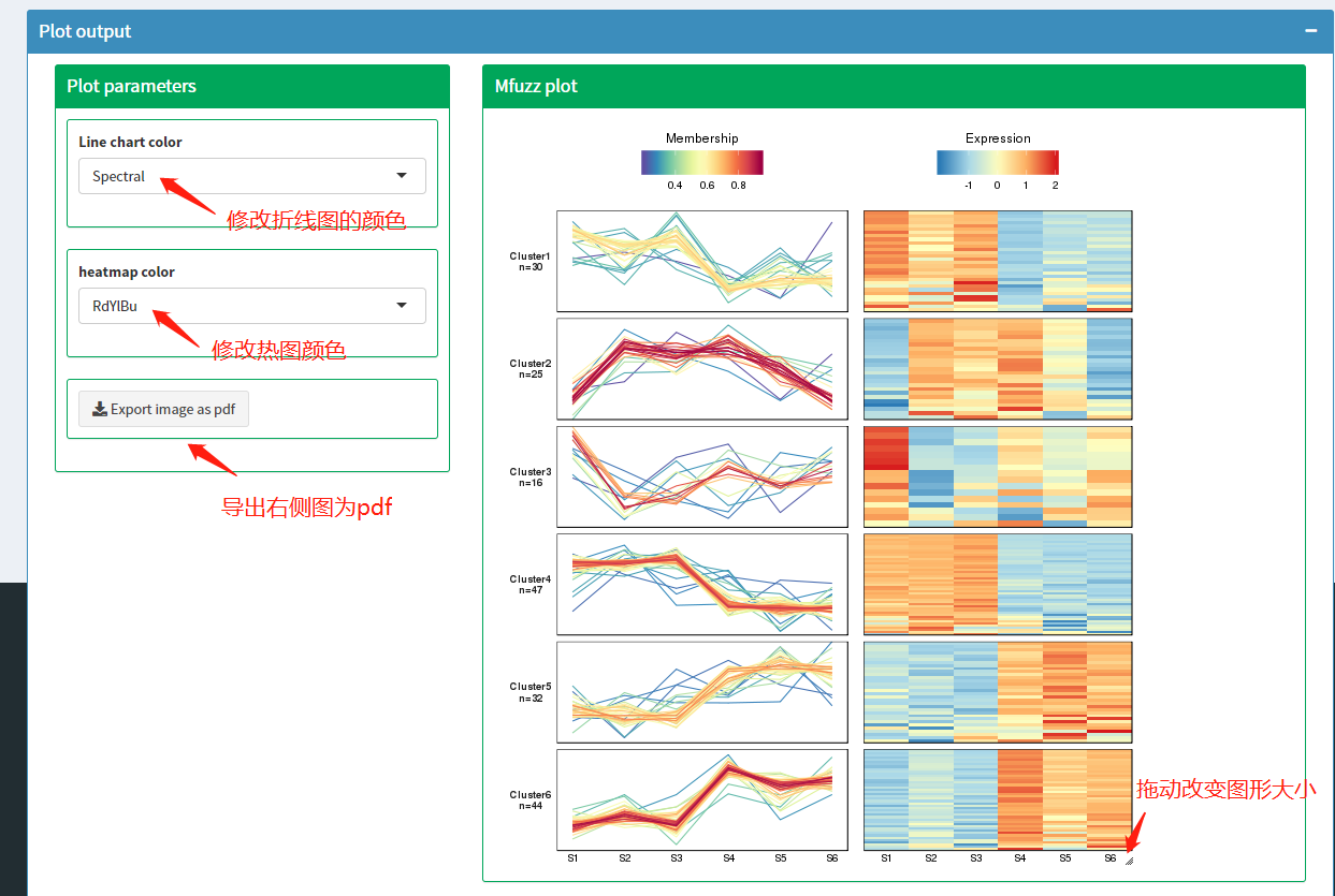 分析完成后,Plot output页面会显示如下图所示图形。左侧有两个参数可以调整图形颜色,有一个按钮可以导出图形为pdf,图片右下角按钮拖动可以调节图片大小。