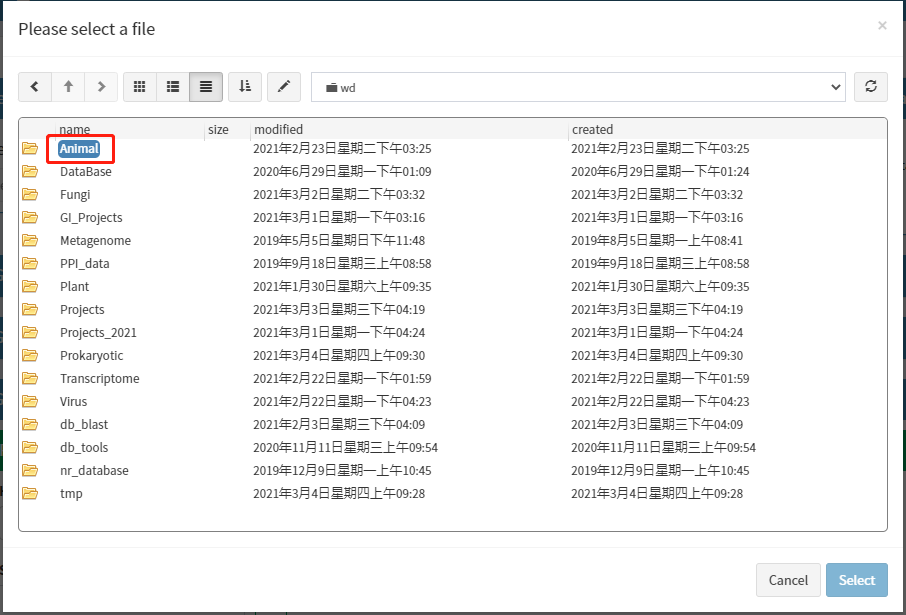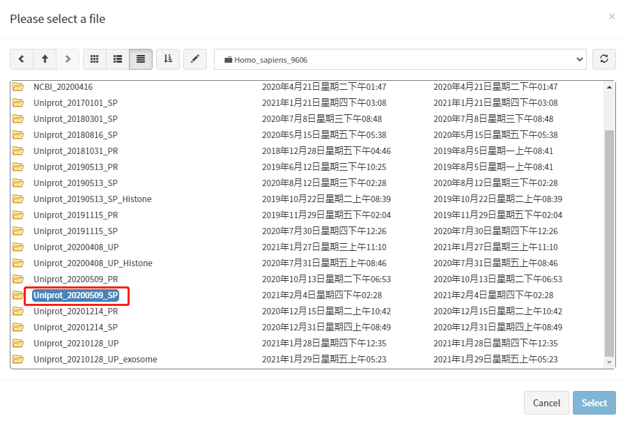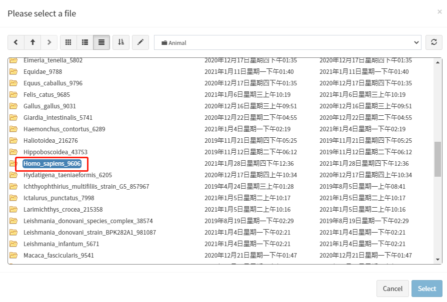 在确定物种拉丁名后,点击'File select'按钮进入数据库文件浏览页面。根据物种信息选择对应的物种分类文件夹,然后再选择对应物种的拉丁名命名的文件夹(命名规则:物种拉丁名+物种号)。