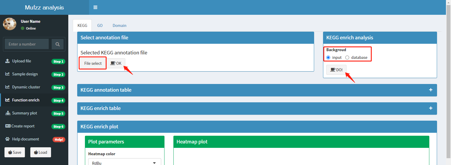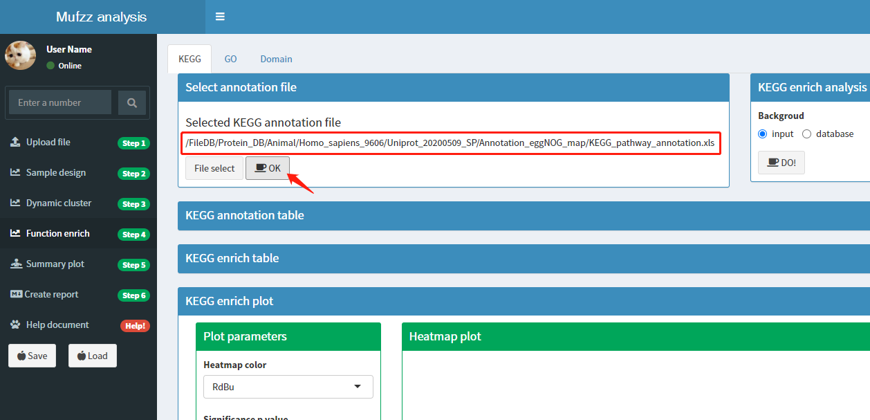 进入该页面后,页面最上方会出现导航栏。导航栏对应'KEGG/GO/Domain'三个子页面,分别对蛋白进行KEGG、GO和Domain的富集分析。富集分析过程有两个参数需要选择:1)物种数据库;2)富集背景。下面以KEGG富集过程为例说明: