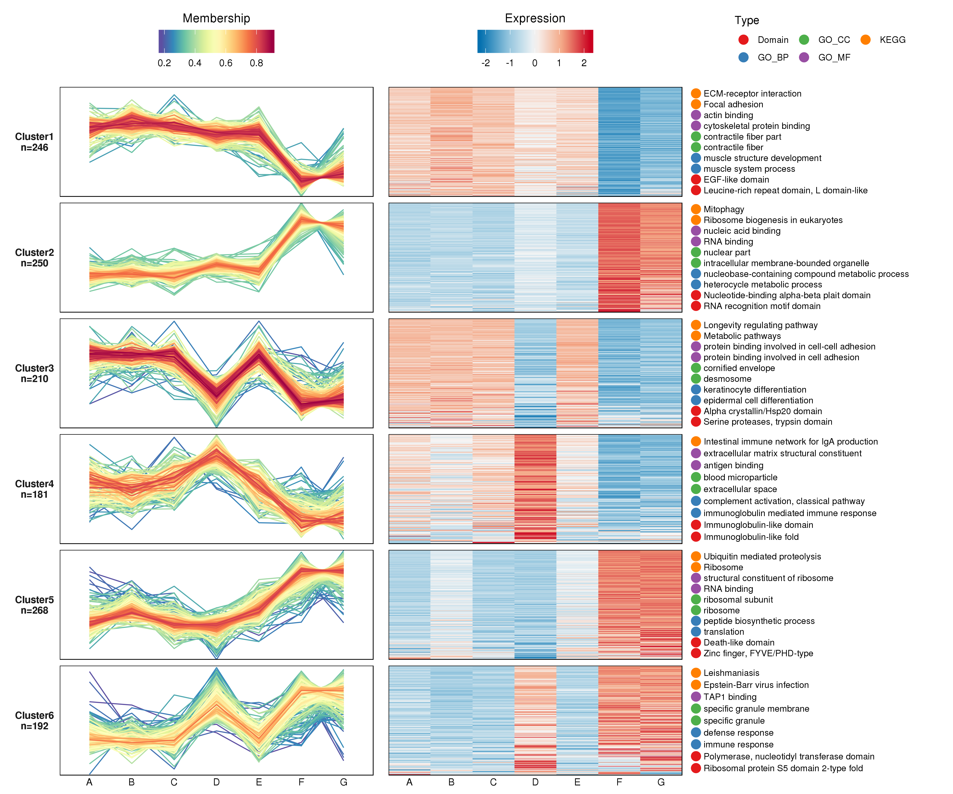 此工具对不同连续样本(如不同处理时间或药物浓度)下蛋白的表达进行聚类分析,采用了一种新的聚类算法:模糊c均值聚类(Fuzzy C-Means Clustering,FCM),相比K-means等hard clustering算法,一定程度上降低了噪声对聚类结果的干扰,而且这种算法有效的定义了基因和cluster之间的关系。为了进一步了解每个cluster中蛋白参与的生物学过程,我们分别对对每个cluster中的蛋白进行了GO功能、KEGG通路和蛋白结构域的富集分析。