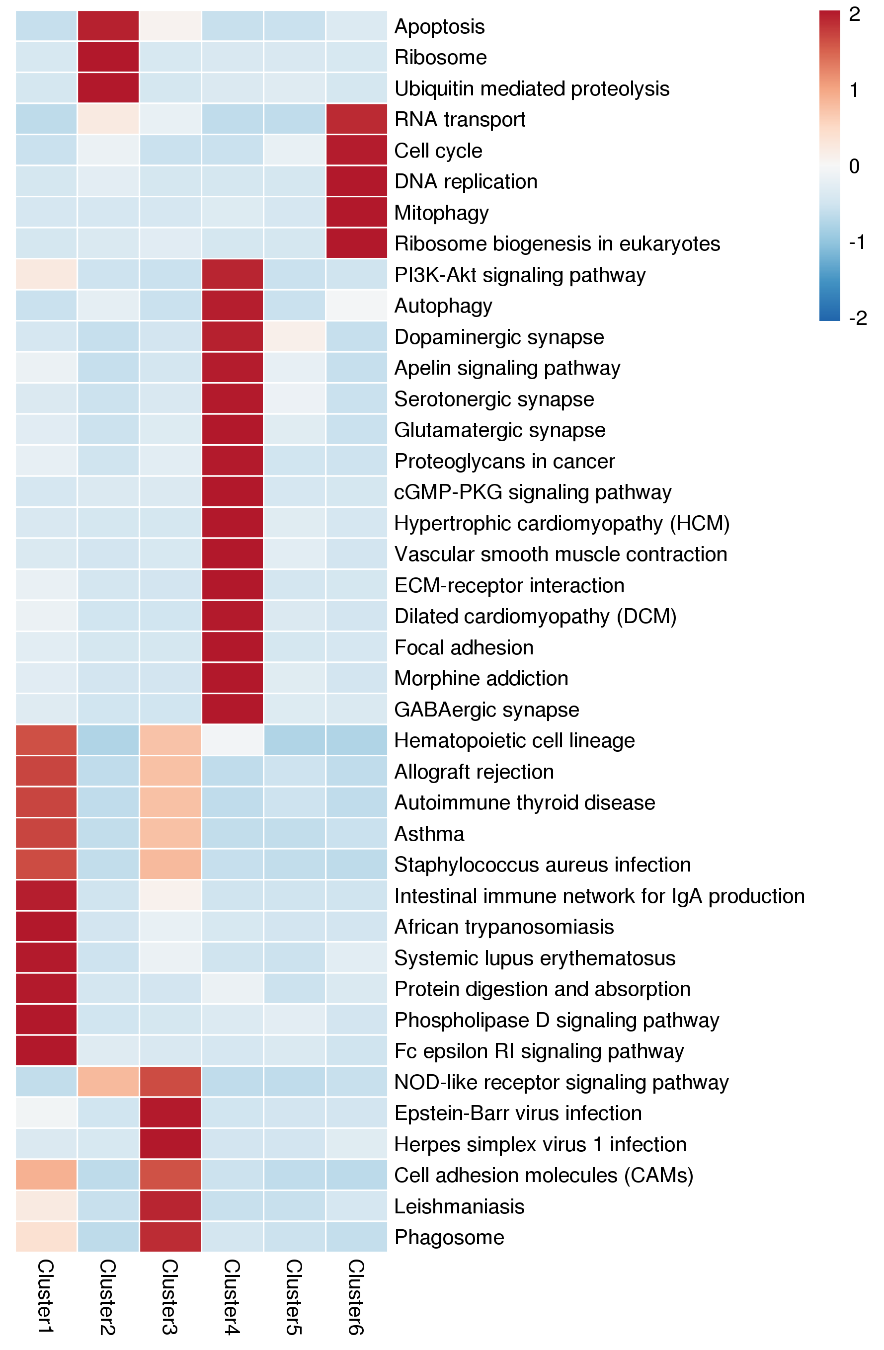 注:基于蛋白cluster的功能富集聚类分析热图。 横向代表不同的clsuter;纵向为clsuter蛋白显著富集的KEGG通路。不同cluster中的蛋白与KEGG通路对应的色块表示富集程度强弱。红色代表富集程度强,蓝色代表富集程度弱。